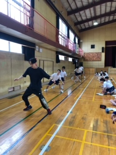 体育の授業での反復横跳びの場面です。 技術科の川浪先生も見本を見せるべくチャレンジしました。