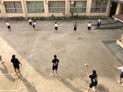 放課後、中庭ではバレーボール部が活動をしています。1年生も練習を頑張っています。