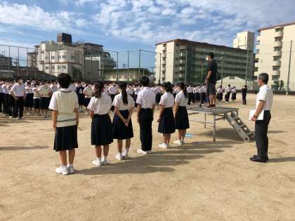 今日の全校集会では生活指導の先生から、緊急事態宣言は解除されました感染のリスクを下げるためにいま一度マスクの着用の徹底について話がありました。また校長先生からは、大阪発祥のカバンの老舗のお話がありました。社訓の内容から何が大切か、それが中学生にも精通するものでした。
