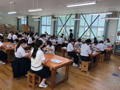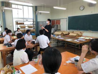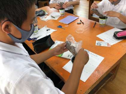 技術の授業ではラディッシュの栽培をしています。土の量と水の量について説明を聞き、それぞれ土を入れています。