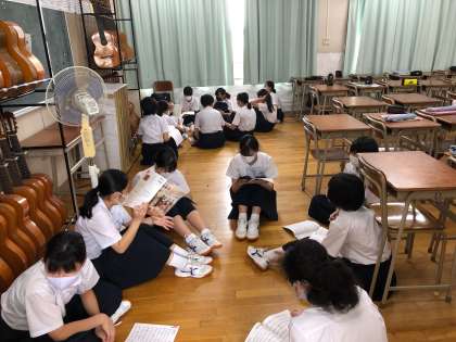 2年生の音楽では各パートで音楽を聴き、パートの音律を覚えています。