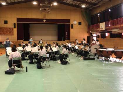 おはようございます。今日は吹奏楽部がコンクールに出ます。朝から体育館で音合わせをしています。みんなで最高のハーモニーを!