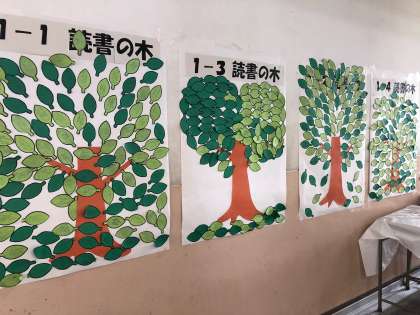 1年生は毎朝読書の時間を設けています。1冊読み終われば1枚の葉っぱとして読書の木に茂ります。4クラスともたくさんの本を読んで、大きな木になりました。