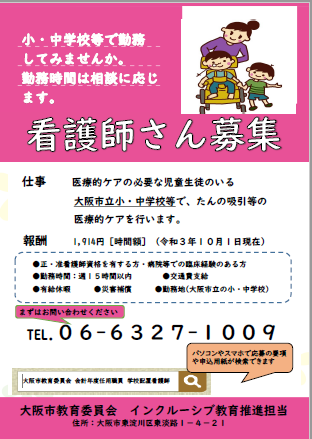 大阪市の小学校や中学校には、たんの吸引や胃ろう、導尿等、医療的ケアを必要とする子どもたちが多く学んでおり、安心・安全な学校生活を送るためには、看護師さんのサポートが必要です。