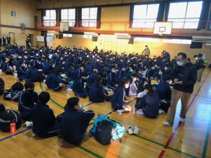 今日から3年生は修学旅行です。3年生は体育館に集合し、健康観察をしています。
