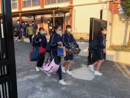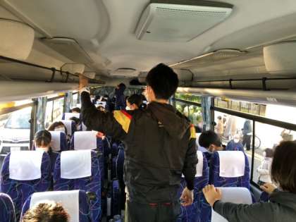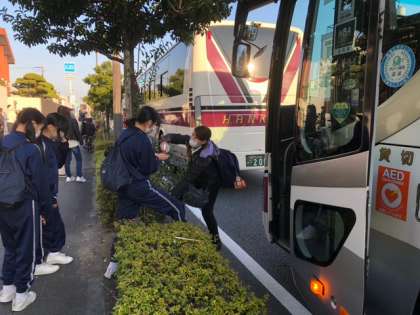 バスに乗り込む前にも感染対策をし、3年生は無事出発しました。