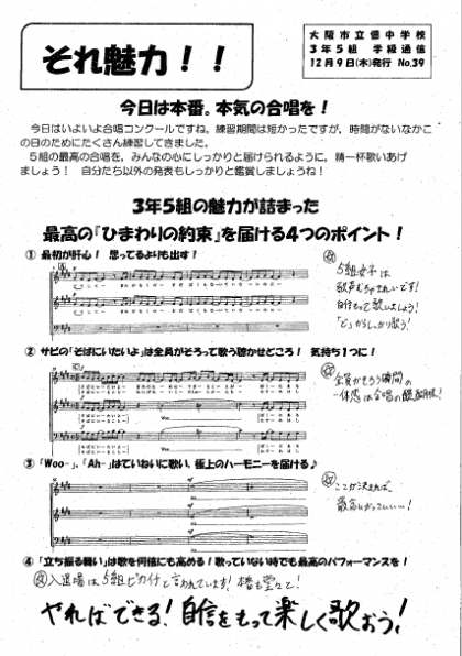 12月9日に合唱コンクール本番がありました。本番前に5組の生徒に伝えたい4つのポイントを通信にして配付しました。