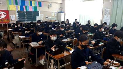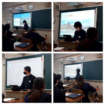 社会の授業では、「世界旅行のツアーを企画しよう」というテーマで1人1人がスライドを使って発表していました。