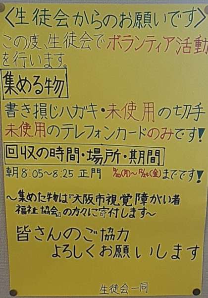 集めたものは『大阪市視覚障がい者福祉協会』に寄付されます。みなさんのご協力をお願いいたします。