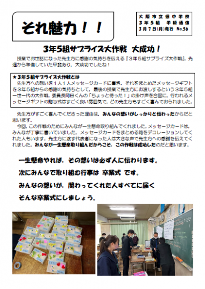 3月7日(月) 3年5組それ魅力!! 公開日 2022/03/07 更新日 2022/03/07 お知らせ 3年5組サプライズ大作戦 大成功!! 詳細はクリックしてください。 [それ魅力!!No56] いいね(0)