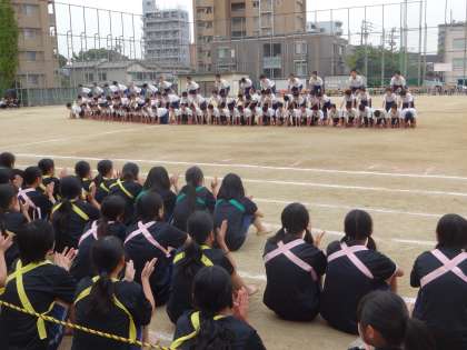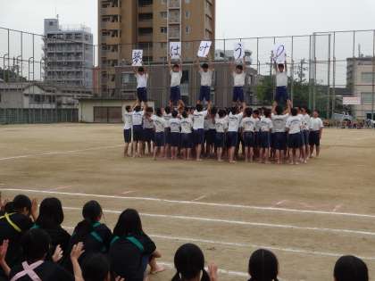 3年生男子は「組み体操」。力強く、中学生の迫力を感じました。「夢は叶う!」の言葉。3年生それぞれがしっかりと、自分を見つめなおし、前(将来)に向かってしっかりと歩んでほしいものです。ガンバレ!!3年生。