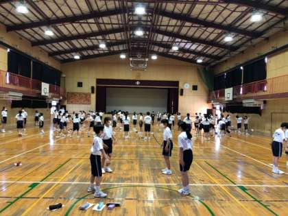 1時間目に1年生の体育の様子を見に行きました。各班で生徒たちはラジオ体操を練習していました。