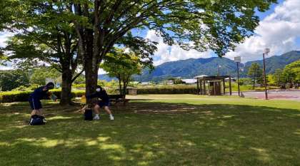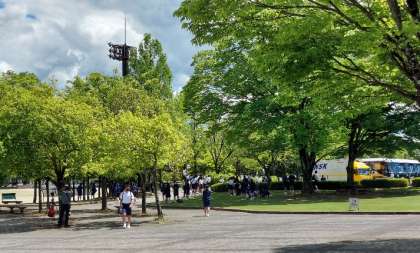 飯田運動公園に着きました。山の景色がとてもきれいです。今から昼食です。