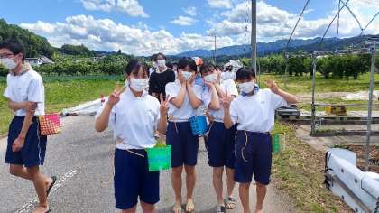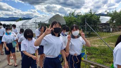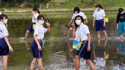 田んぼへ向かう様子と、田んぼへ入って、はい、チーズ!