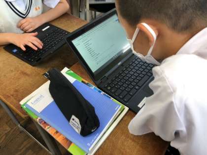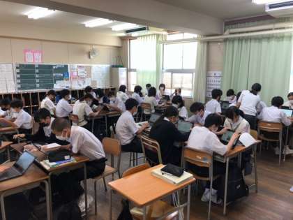 昨年、社会科の授業では生徒たちに調べ物学習をし、生徒たちのプレゼンを授業で行いました。その経験から生徒たちは1人1台端末を使い、プレゼン資料を作っています。