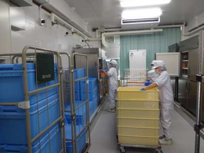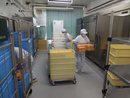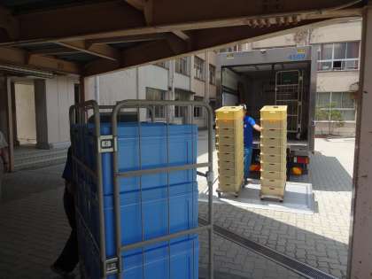 午前中トラックで給食が運ばれてきます。配膳室に入れます。配膳員さん3人で数など確認しながら、配膳室ではおかずと牛乳は冷蔵庫へ、ご飯は温蔵庫にいれ、配膳するまでしっかりと衛生管理をします。