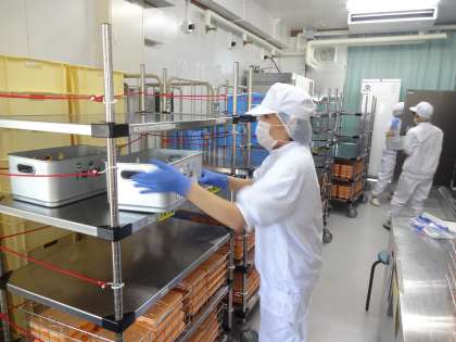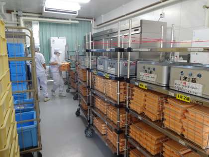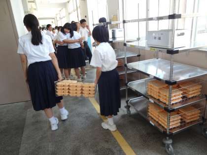 4時間目の終了近くから、配膳員さんがワゴンに給食をのせ、各階に運ぶ準備をします。現在は1・2年生が全員喫食で約360食あります。配膳員さんと先生で各階に運搬。4時間目が終了したら、当番の生徒が給食を取りに来て、各教室で配膳します。