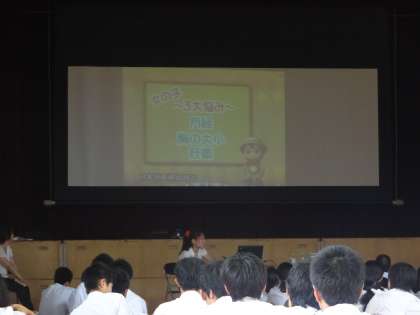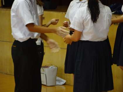 本日の5・6限に体育館で3年生の全クラスが西淀川区のNPO法人による性教育の学習をしました。生徒たちは男女の違いやそれぞれの持っている良さなど、たくさんのことについて真剣に学びました。また、感染症の広がりや怖さについて、各クラスの代表者が手に粉をつけ握手することで広がることや、ゴム手袋で防げることのワークショップも体験しました。