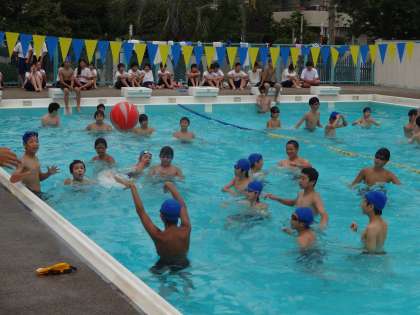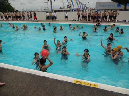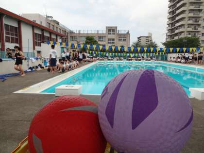 本日の3・4限に2年生は水泳大会をしました。男女とも水球をし、学級ごとに試合をしました。生徒は楽しそうに学級のために協力し、試合をしました。結果は優勝が2−1で、準優勝が2−3でした。