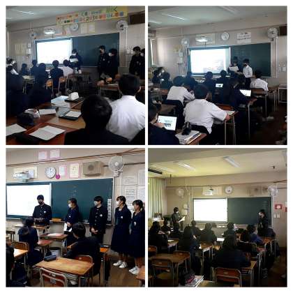 前日までに、それぞれの班で協力してスライドを作成し、発表に向けて一生懸命練習してきました。どの班もしっかりまとめており、とても分かりやすく発表していました。