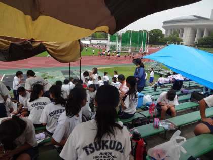 昨日、今日と2日間にわたり長居陸上競技場で大会が行われています。昨日は100mハードル走から始まりました。3年生にとっては最後の試合。それぞれの競技で全力を出してください。写真は本校陸上競技部の応援席と一番下の写真は最初の競技、ハードル走にでる3年生女子です。陸上競技部ガンバレ!!!