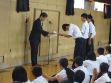最後は、夏休みの部活動の賞状伝達です。吹奏楽部、陸上競技部、水泳部とたくさんの賞状がありました。中には優勝や2位でメダルもありました。