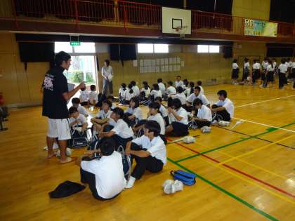 昼食後、2年生は体育館に集まり、担当の先生よりあいさつの大切さやマナーについて話があり、職場ごとに分かれて体験する職場へ配布するものを受け取り、雨の降る中出発しました。