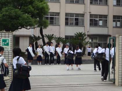 生徒会には現在、2年生が3名、1年生が4名、立候補しています。今週に入って、この7名が朝の登校時にたすきをかけて登校する生徒にあいさつと呼びかけをしています。佃中の生徒の代表としてがんばってほしいものです。