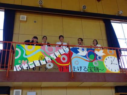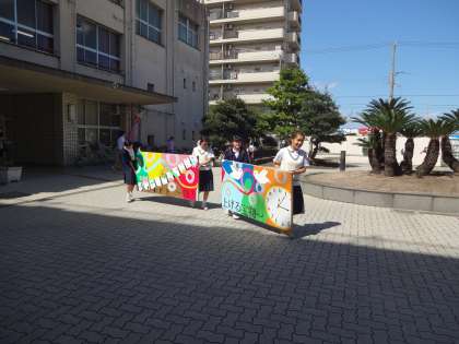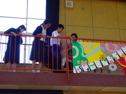 先週のテスト最終日の金曜日に夏休みに作成した学芸発表会の看板を体育館にかけました。