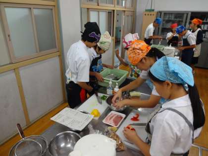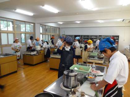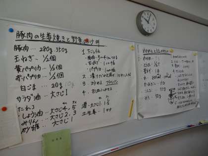 調理内容は生姜焼きがメインでした。家庭科室いっぱいに生姜のにおいなど、食欲をそそる雰囲気でした。男女が協力し、一生懸命調理をしていました。
