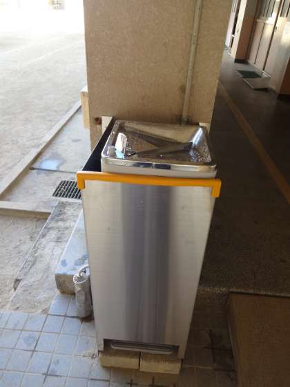 現在管理作業員室の横と保健室前に2台あります。みなさんがていねいに使用しています。みなさんの物を大事にする行動を見ていて、PTAのみなさんが生徒に何かできないかと考えていただき、佃の会の理解もあり、ピロティと体育館前に新しいウォータークーラーを設置していただくこととなりました。
