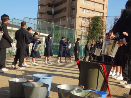 しかし、校長からは「自分の命は自分で守る」ことから、もしものことをきちんと頭に入れ、今後は訓練に臨んでほしいという話もありました。その後、各学級代表の生徒2名、計30名でバケツリレーの練習をしました。