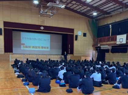 6時間目は西淀川警察の方にお越しいただき、スマホ安全教室を行いました。携帯電話、スマホを使うことで起きるトラブルや犯罪についてお話をしていただきました。被害者にも加害者にもならないために、正しい使い方を身につけましょう。