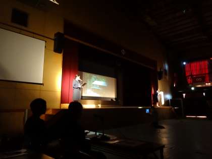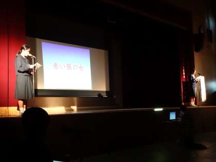 元の話があり、その話に文芸部員が脚本をしました。したがって話の一部は自分たちで考えたオリジナルがありました。「赤い服の女」「能面」という題でした。文芸部の生徒が読み聞かせを行いながら、画像が流れてきます。会場のみんなが、その話に聞き入り、話の怖さを十分感じることができました。文芸部員は上手に、みごとに話を読み上げ、会場がその話にのめりこみました。