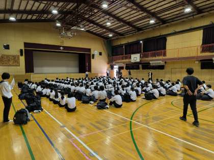 本日から一泊移住が始まり、生徒たち全員、元気よく登校しました。現在出発式が行われているところです。