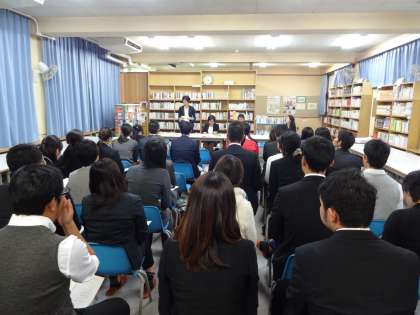 他校から40名ほどの英語の先生が集まり、授業を参観した後、指導助言として大学の先生や教育委員会からも来校いただき、図書室で研究協議会をしました。