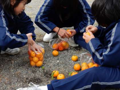 まず、ミカン狩りですが、その場で食べるのはいくつでもOKです。持って帰るのは袋に詰めた分だけです。現地で30個食べた生徒がいたそうです。