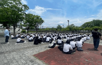 飯田運動公園に到着し、4台のバスが合流しました。クラス写真を撮影後、馬籠宿へ向かう予定です。