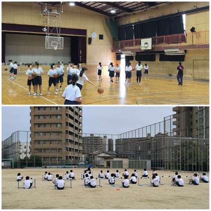 体育の授業では、男子はハードル走を、女子はバスケットボールを行っています。女子は頑張ってシュート決めています!