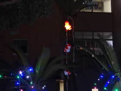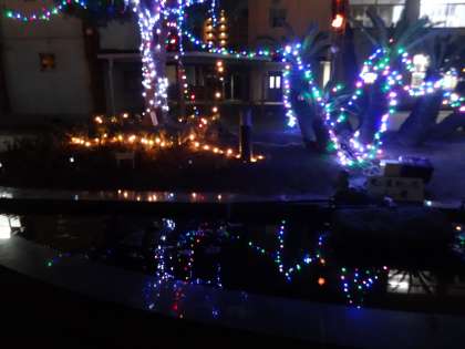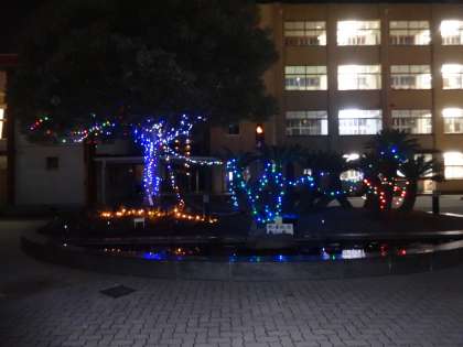 以前にもお知らせしましたが、正門前の池のところに飾りつけが完成し、10日より夜の7時ぐらいまで点灯しています。懇談等でご来校いただいたおり見ていただければと思います。池にもライトがうつりきれいです。