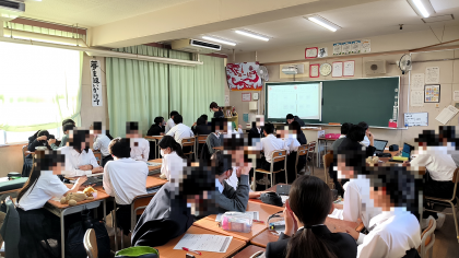 本日の6限目に、1年生は平和学習を取り組みました。グループで「平和」とは何かを話し合っている様子です。