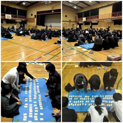 昨日の5、6限目に、1年生は百人一首大会を行いました。前日までに生徒たちは一生懸命に百人一首を覚え、本番に向けて練習をしてきました。本番では、皆さんが真剣に、楽しく札をとっていきました。
