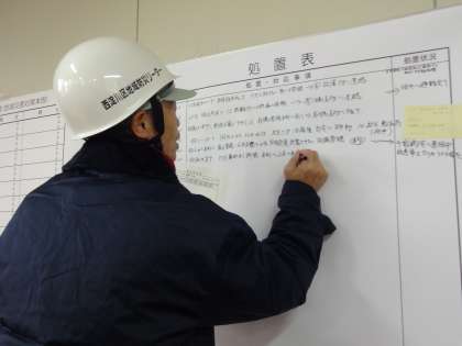 本日の午前中に西淀川14地区全てで地域自主防災訓練が実施されました。本校では10時前に地域の皆様が集まり、技術室を佃地域の本部とし、開設訓練をされました。救護室の準備や備蓄物資の確認など一生懸命されていました。