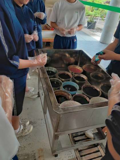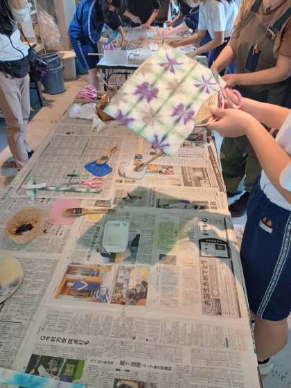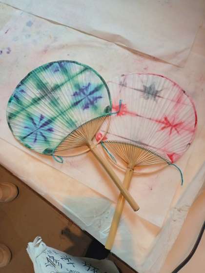 紙漉き体験の後に「染め」体験をしました。和紙だからできる染色「折り染め」と「絞り染め」どちらか選び、自分色に染めた和紙でうちわを制作しました。