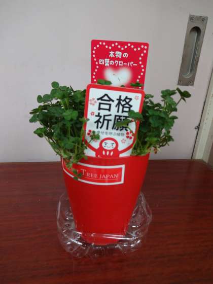 昨日、花屋さんで見つけました。幸せを運ぶ「四つ葉のクローバー」を見つけました。思わず皆さんの努力が実るよう買ってきて、校長室前におきました。