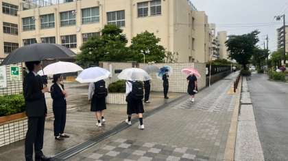 あいにくの大雨ですが、実習生の皆さんが朝のあいさつ指導に来てくれています。