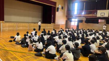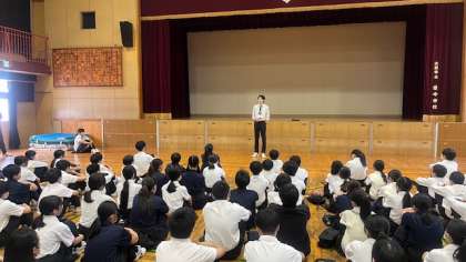 本日の1年生学年集会では、実習生の2人がお話をしてくれました。