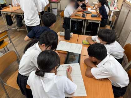 明日の万博校外学習に向けて事前指導をおこないました。「外国の人に出会ったら英語でインタビューしてみては?」など、各班で取り組みをしました。