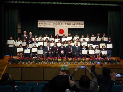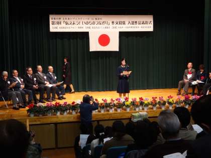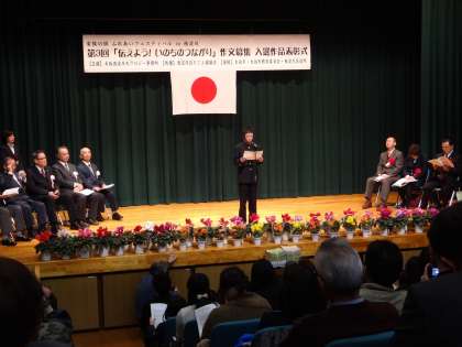 5名のうち2名が会場で作文を読み、発表しました。残念ながらインフルエンザ等で出席できない生徒もいました。皆さんの前で堂々と発表している姿は凛々しいものを感じました。受賞した生徒や作文は学校だよりに掲載します。