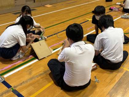 1時間目はダンボールなどの空き箱を使って班でスマホスピーカーを作ってみました。
